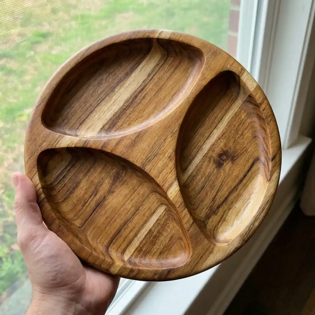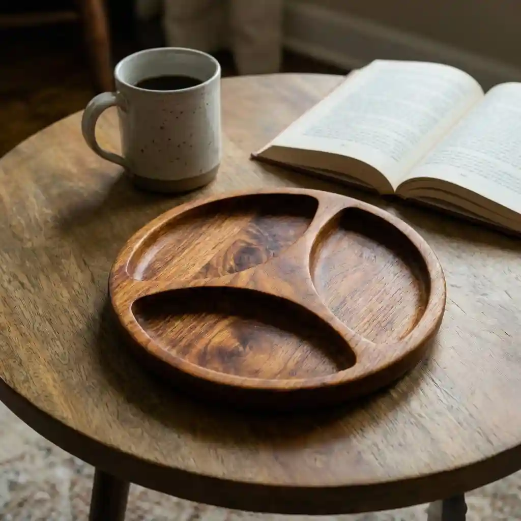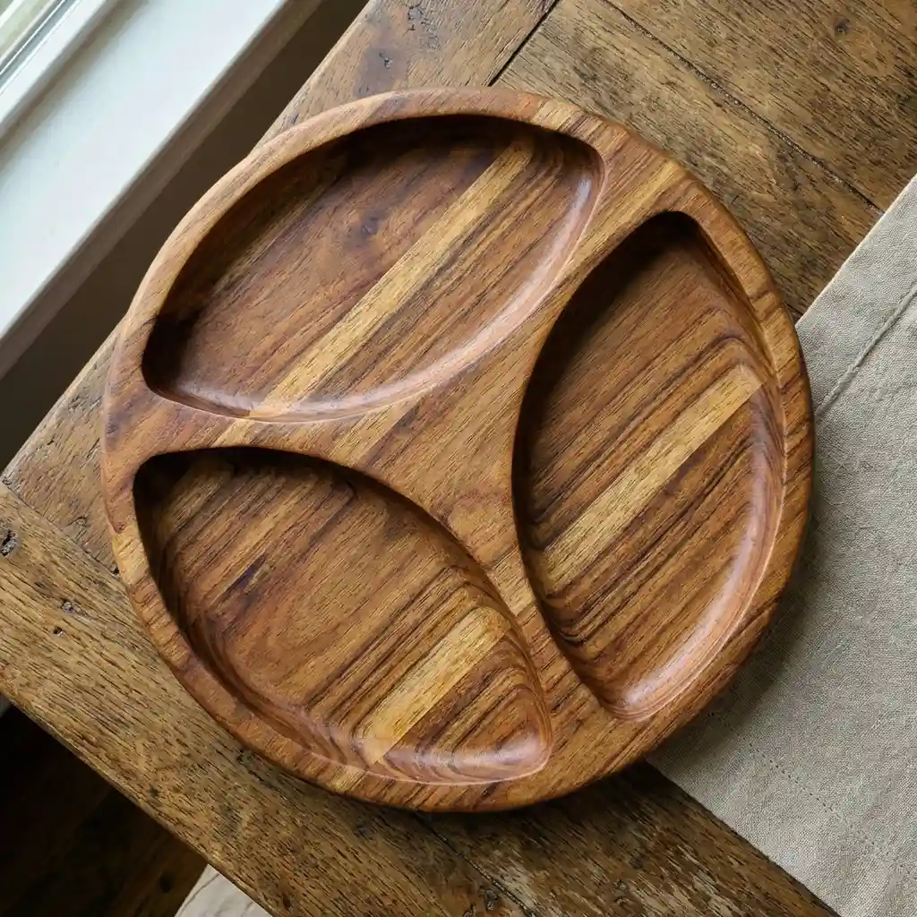 هذا طبق التقديم الخشبي المُقسم ليس مجرد أداة للضيافة، بل قطعة فنية صُنعت بعناية لتُجسّد روح الحِرفة وجمال الطبيعة المستدام.