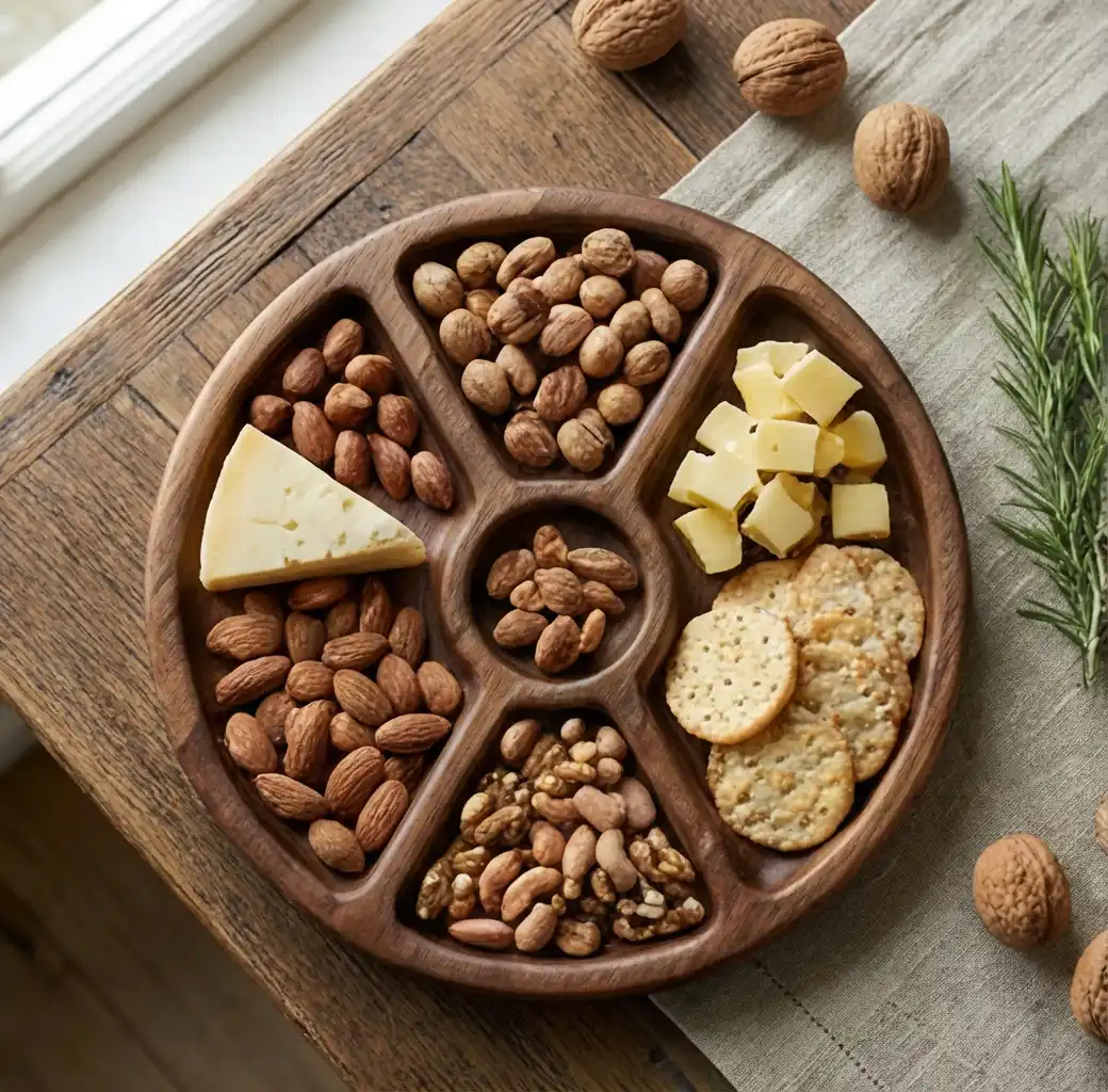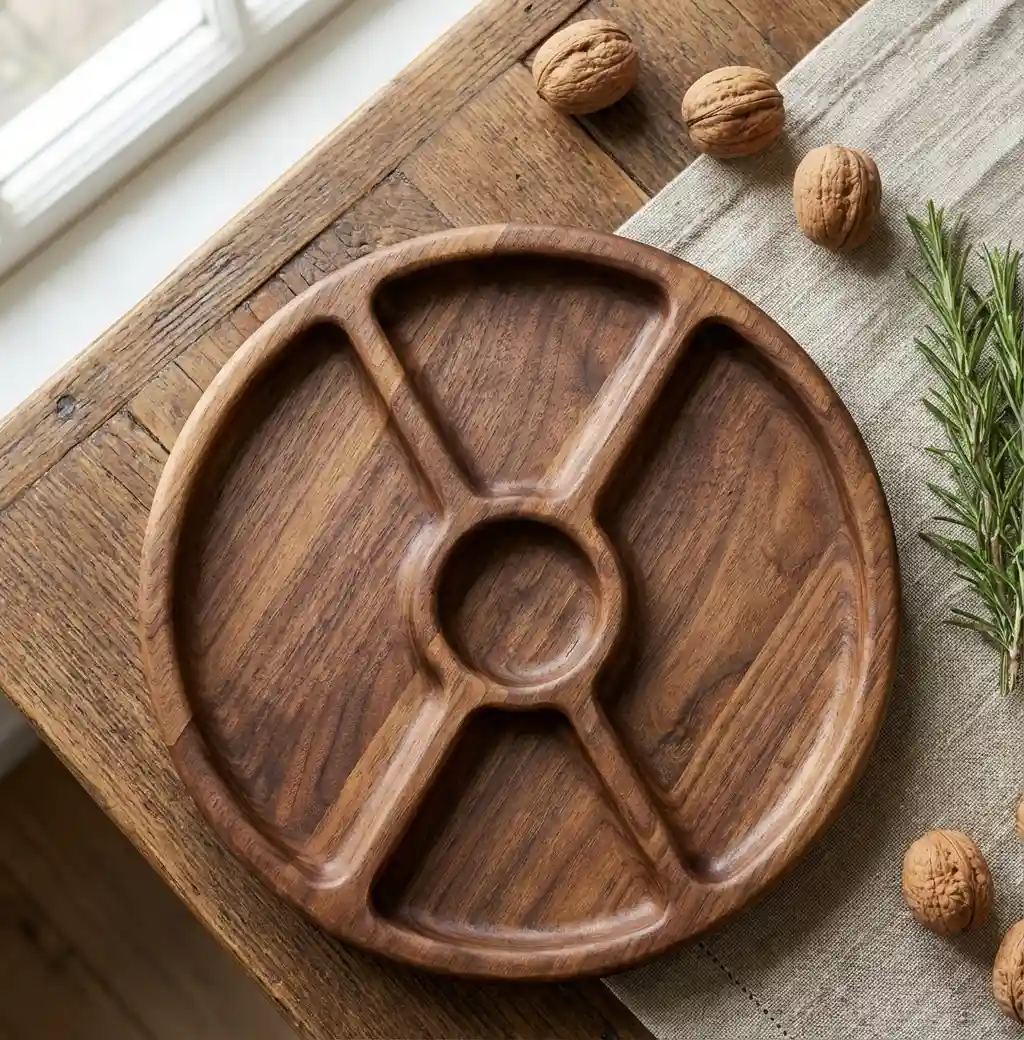 يتميز بتصميم دائري عملي مُقسم يساعدك على تنظيم وتقديم المكسرات، المقبلات، الشوكولاتة أو الفواكه المجففة بأسلوب راقٍ يناسب جميع المناسبات والجلسات العائلية والضيافات المميزة.