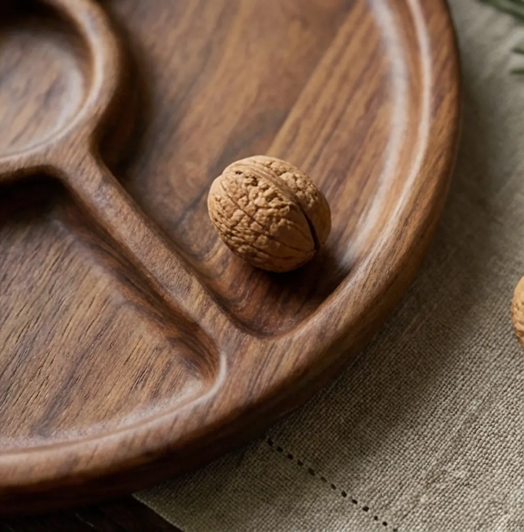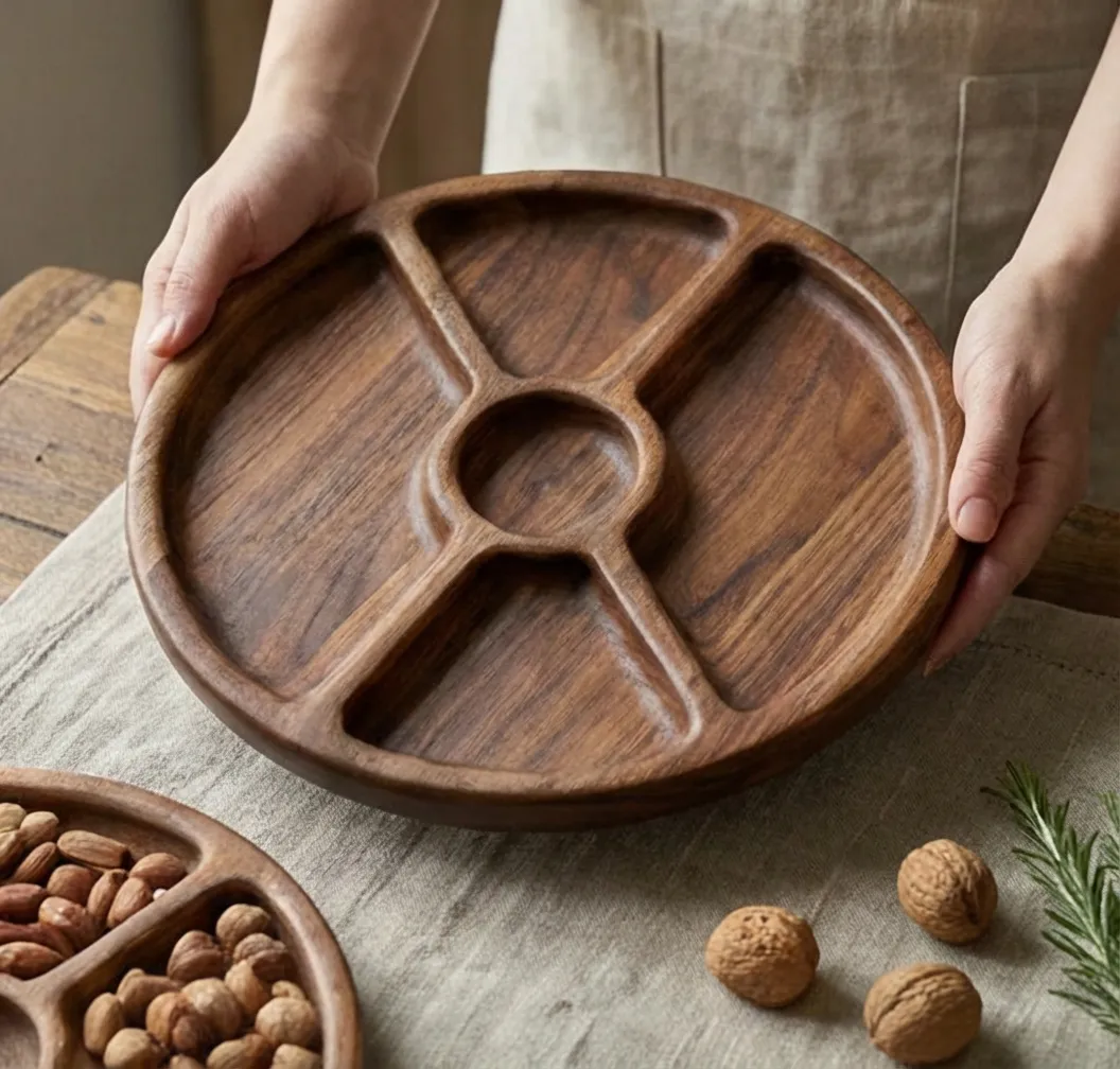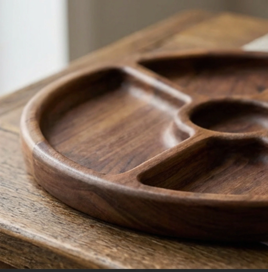 ج.مأضف لمسة طبيعية أنيقة إلى سفرتك مع طبق التقديم الخشبي المُقسم المصنوع يدويًا من خشب السرسوع الطبيعي المعروف بقوته ومتانته وجمال نقوشه الفريدة.