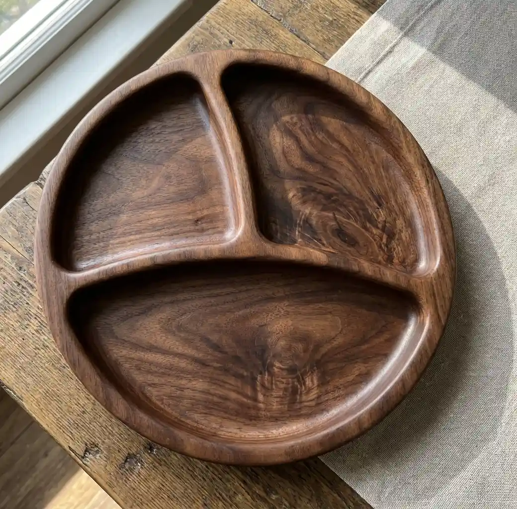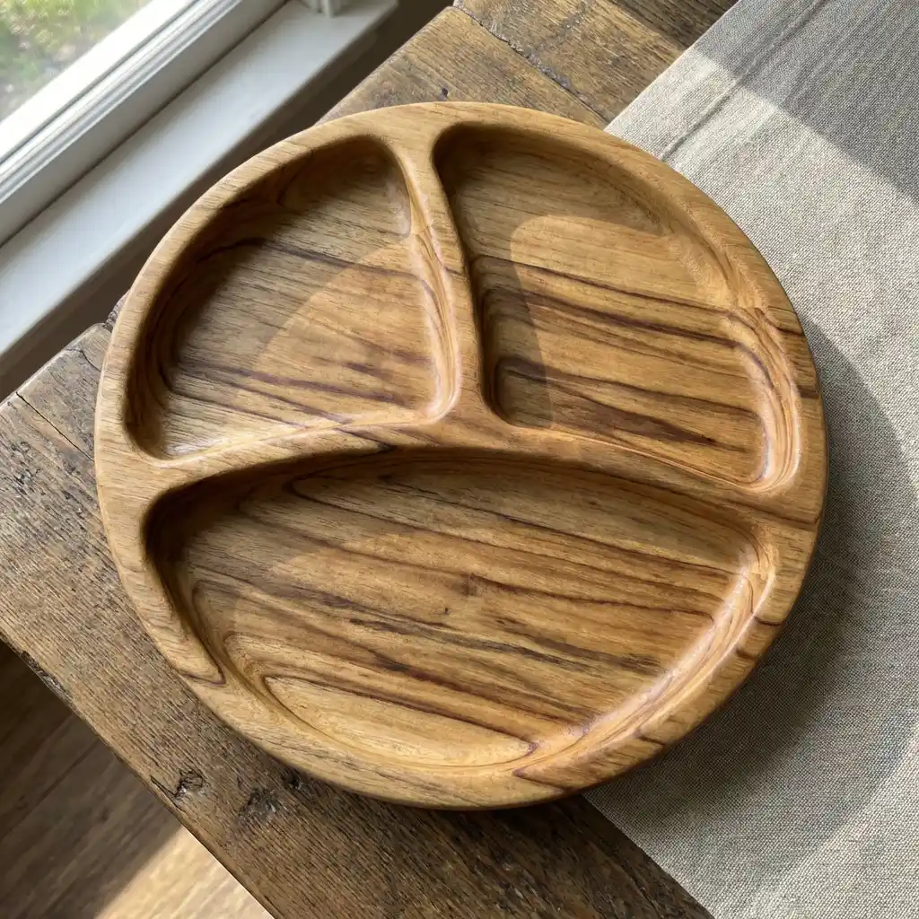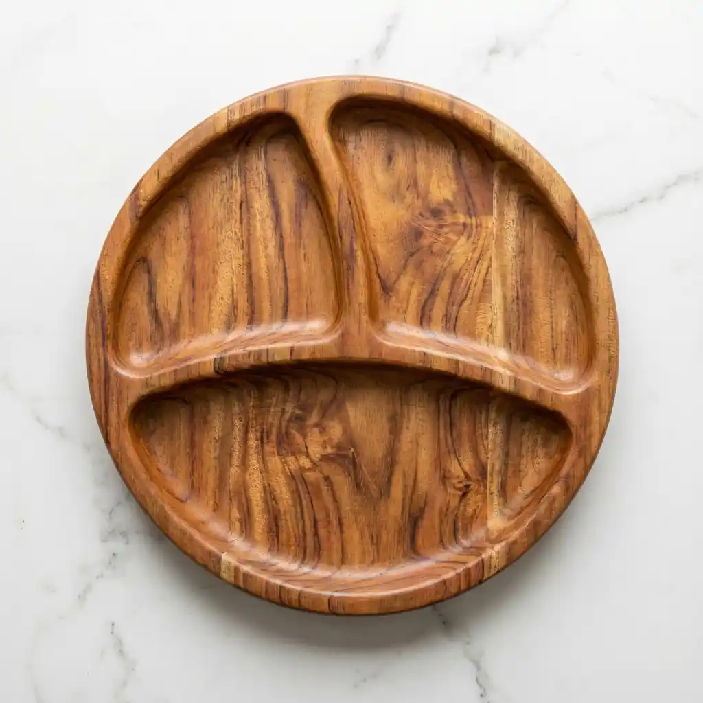 ج.مأضف لمسة طبيعية راقية إلى سفرتك مع طبق التقديم الخشبي المُقسم الدائري، المصنوع يدويًا من خشب السرسوع الطبيعي المعروف بقوته وجمال نقوشه المميزة.