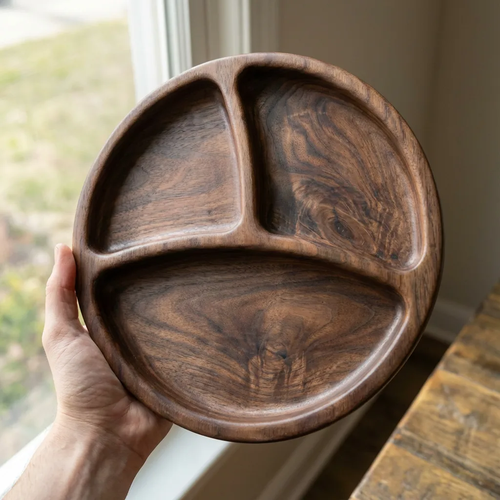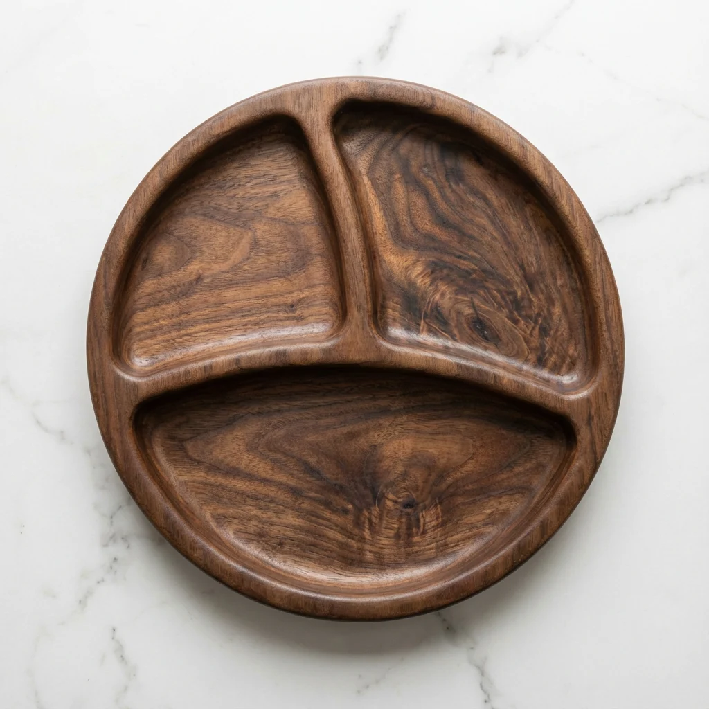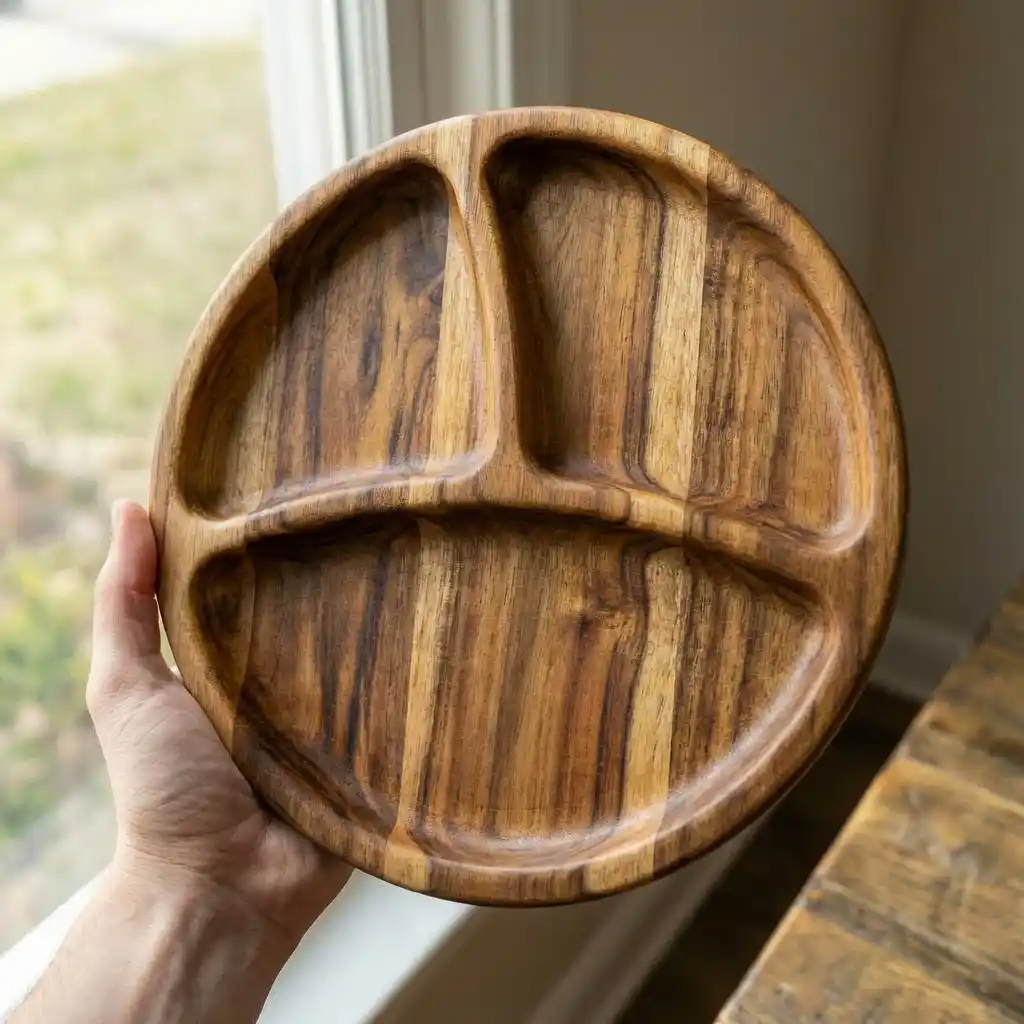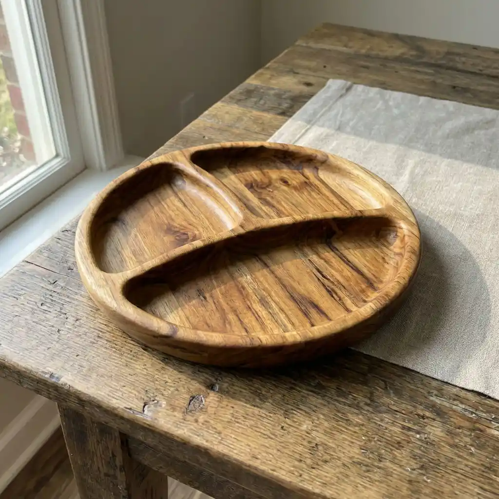 ج.مأضف لمسة طبيعية راقية إلى سفرتك مع طبق التقديم الخشبي المُقسم الدائري، المصنوع يدويًا من خشب السرسوع الطبيعي المعروف بقوته وجمال نقوشه المميزة.