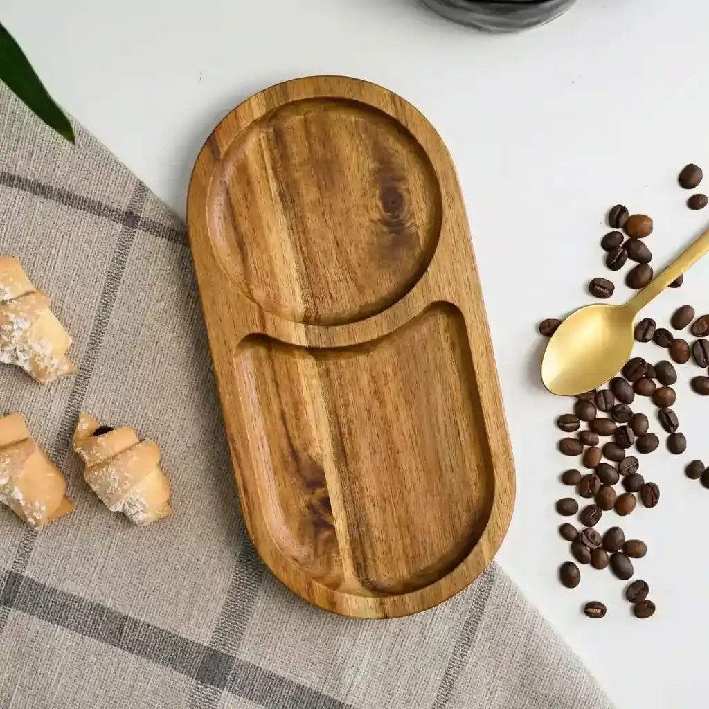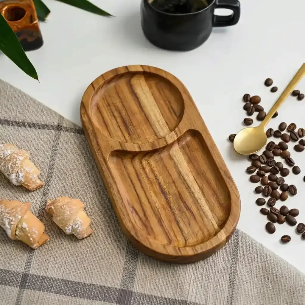 ج.مصينية تقديم مصنوعة يدويًا من خشب السرسوع الطبيعي 100%، بتصميم أنيق ومزدوج الاستخدام يناسب القهوة، السناكس، الضيافة، والديكور. خامة ثقيلة، قوية، ومقاومة للخدش – قطعة فاخرة تضيف لمسة دفء وتميّز لأي مكان.