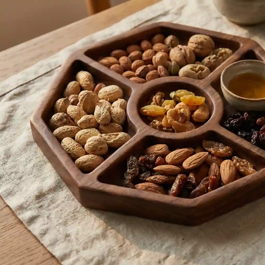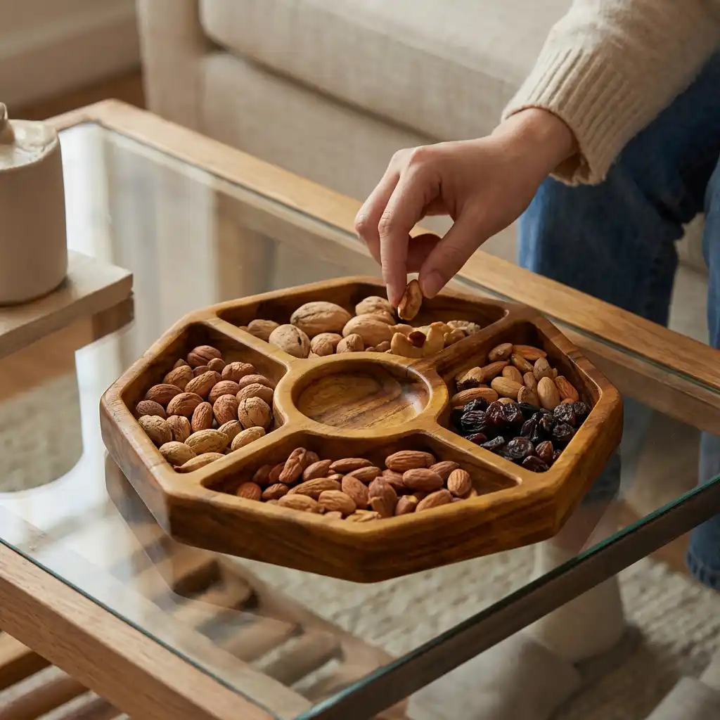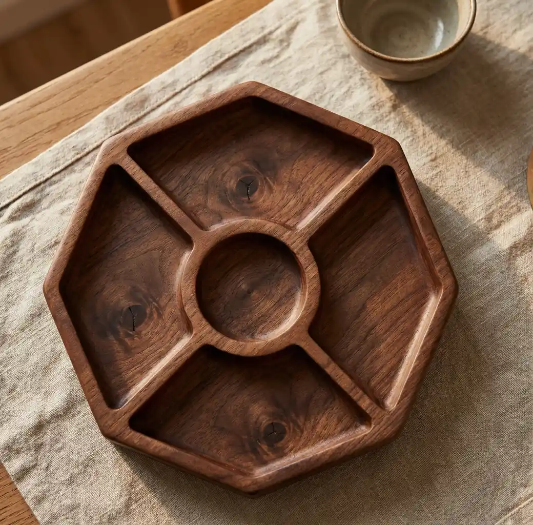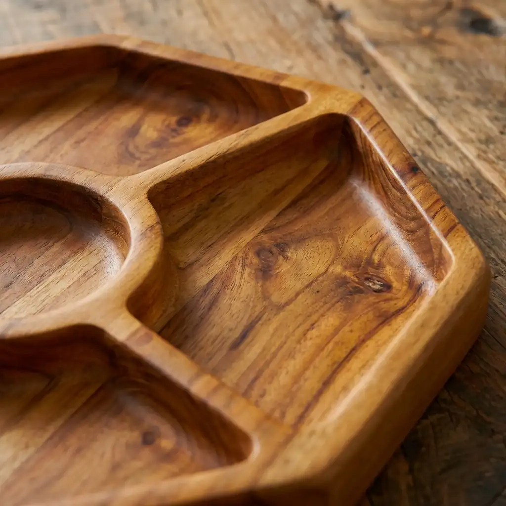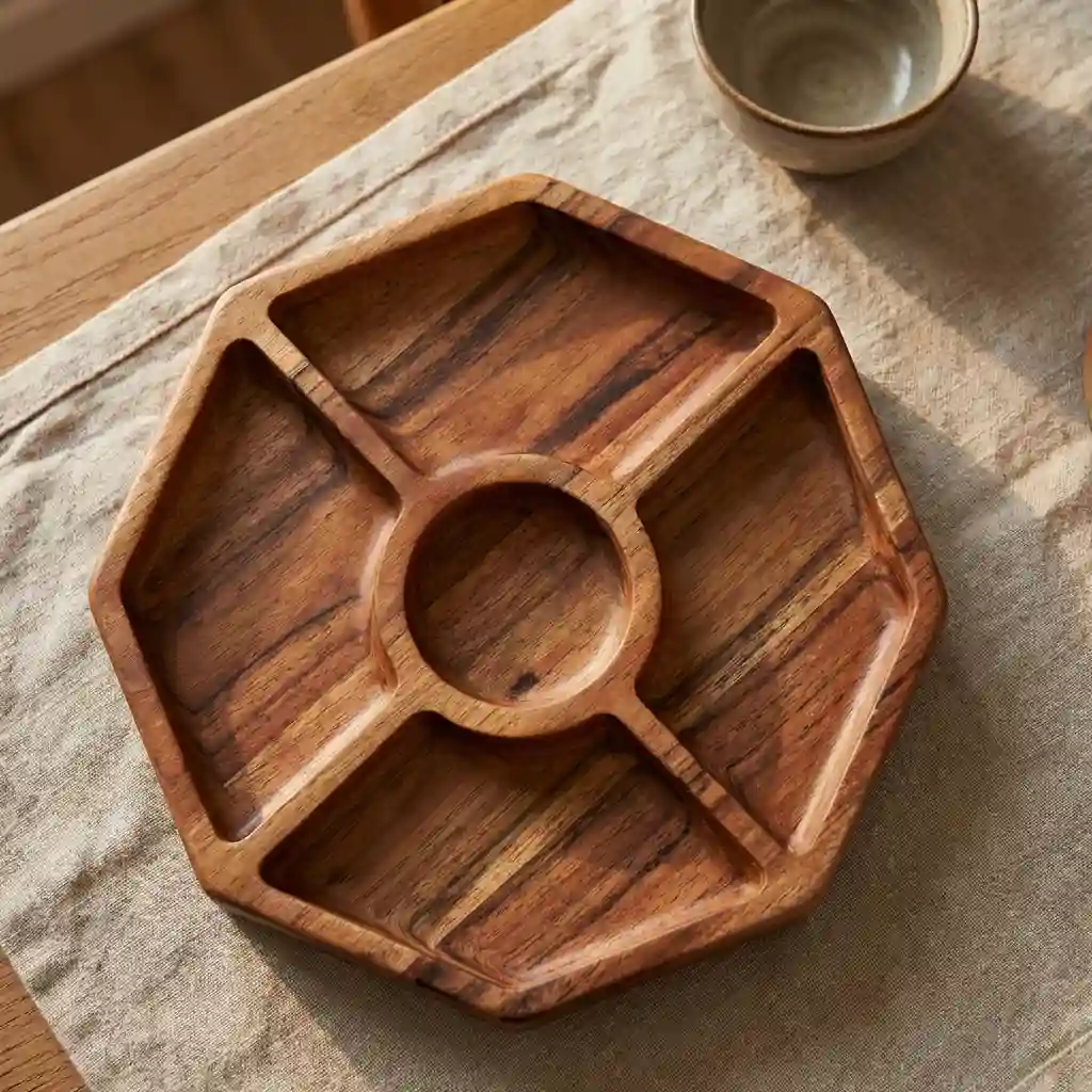 ج.مهذا طبق التقديم الخشبي المُقسم ليس مجرد أداة للضيافة، بل قطعة فنية صُنعت بعناية لتُجسّد روح الحِرفة وجمال الطبيعة المستدام.