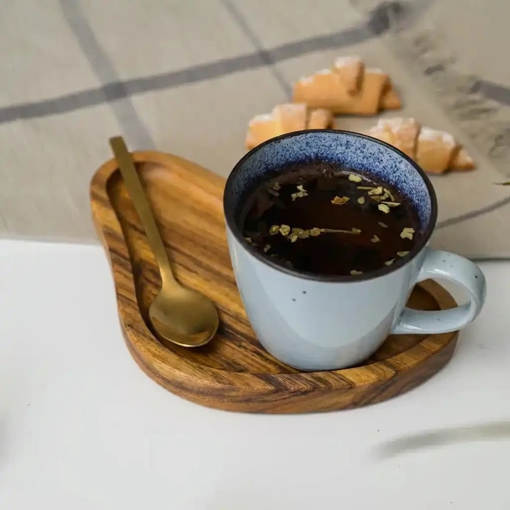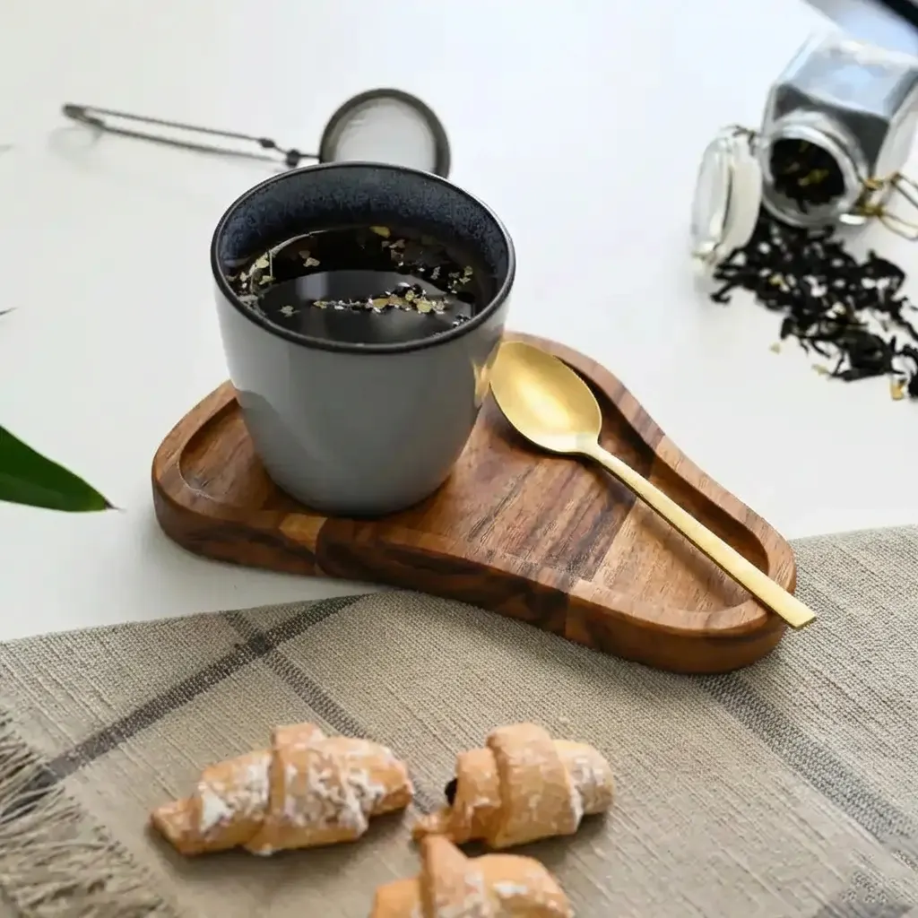 القطعة مصممة بشكل أنيق وانسيابي، وبحجم عملي مناسب لكوب قهوة ومعلقة وسناك بسيط — مثالية للجلسات الفردية أو تقديم الضيافة بشكل راقٍ.