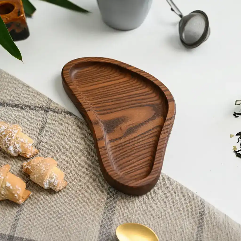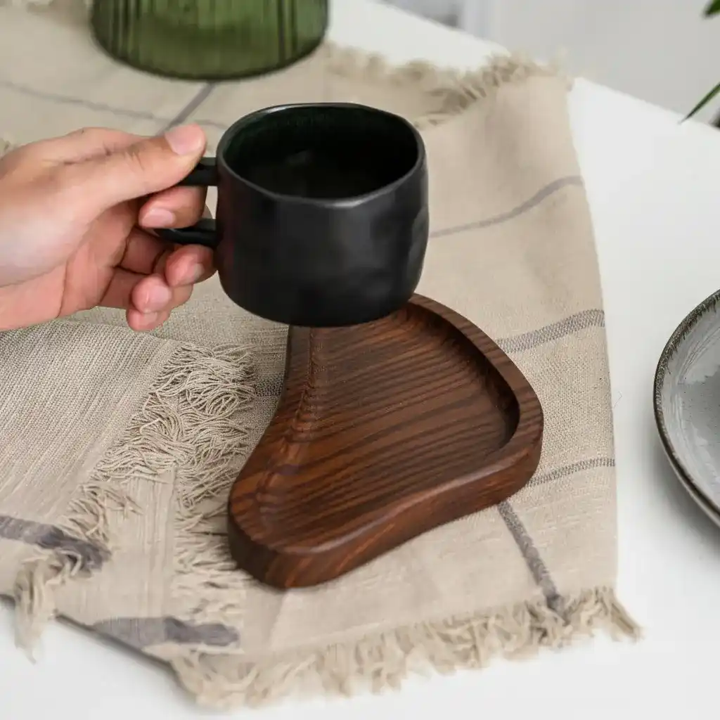 القطعة مصممة بشكل أنيق وانسيابي، وبحجم عملي مناسب لكوب قهوة ومعلقة وسناك بسيط — مثالية للجلسات الفردية أو تقديم الضيافة بشكل راقٍ.